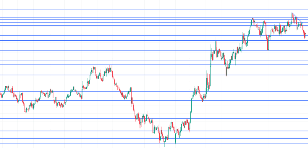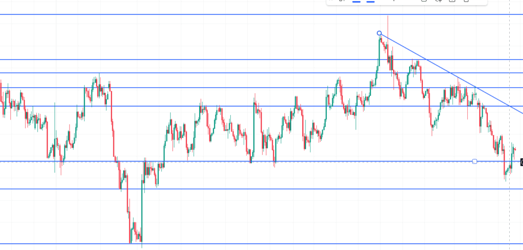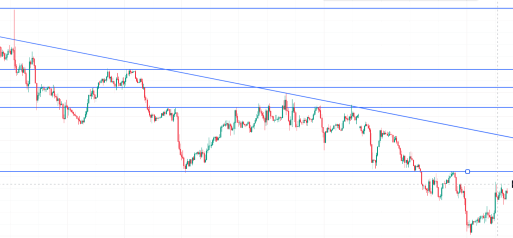 そのためなるべくロウソク足がラインに近づくのを待ち、水平線に対してロウソク足がラインに反発もしくはラインブレイクしたら、その方向についていく形でトレードする予定。