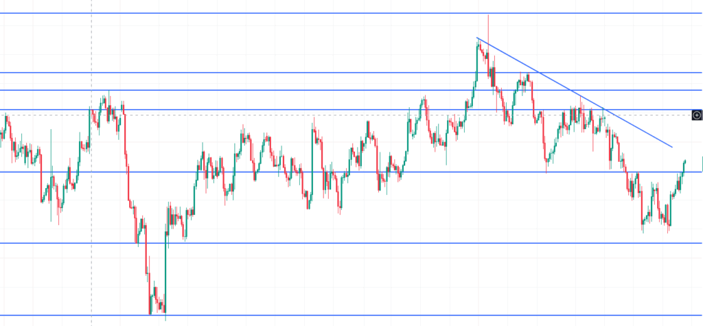 先に結論は「トレンド転換の可能性あり、トレンドラインとロウソク足の関係性が確定してからトレード」