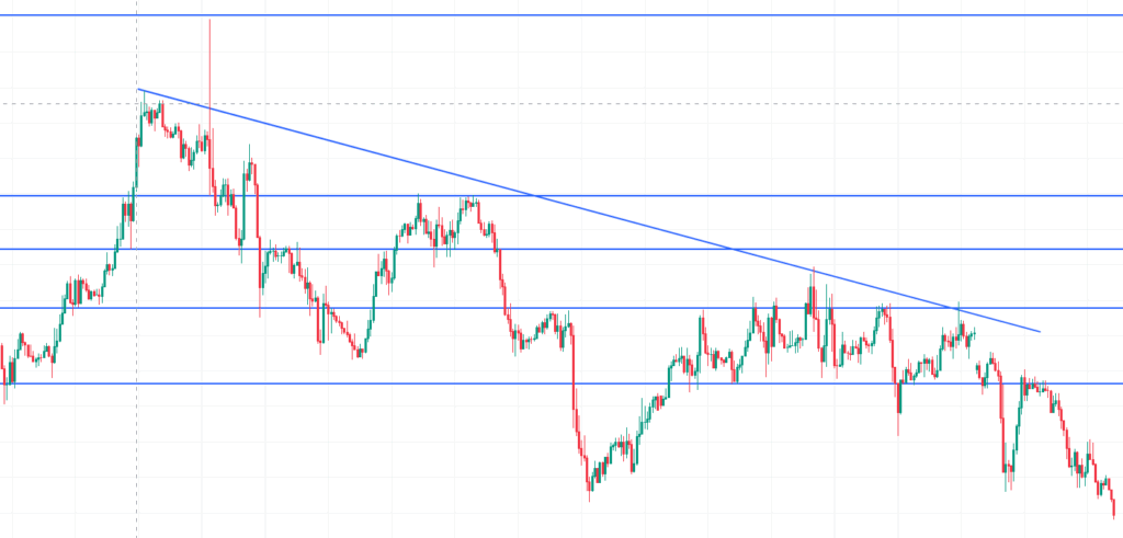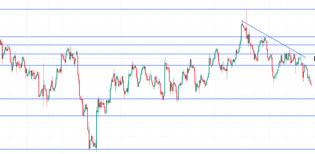 4時間足ではサポートラインを下回り、下降トレンドが継続。