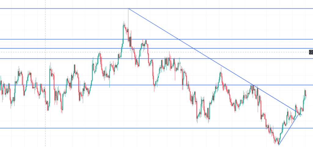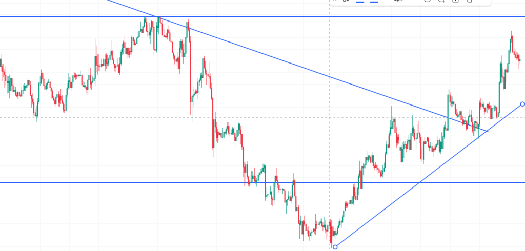トレンドラインに反発したら、もしくはレジスタンスラインをブレイクして上昇するなら、押し目買いを狙います。