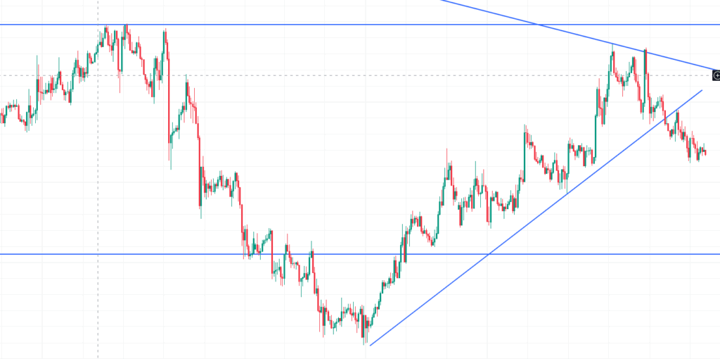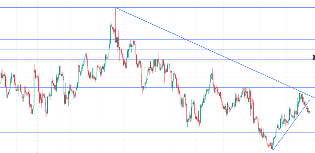 4時間足では上昇トレンドが継続していましたが、現在上昇トレンドの直近安値付近にロウソク足があります。