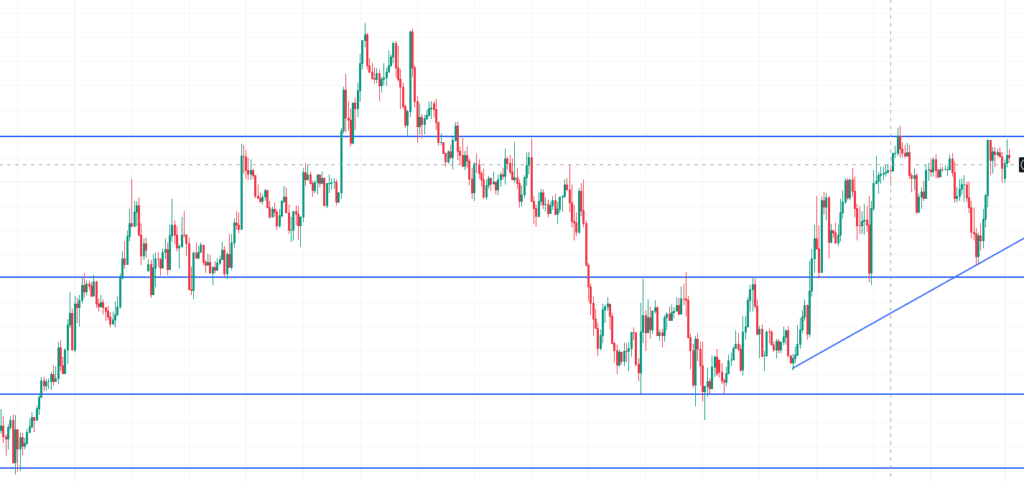 現在は高値安値が更新されない(上下2本の水平線に挟まれた状態)なので、どちらかの水平線をブレイクするまで待ちます。