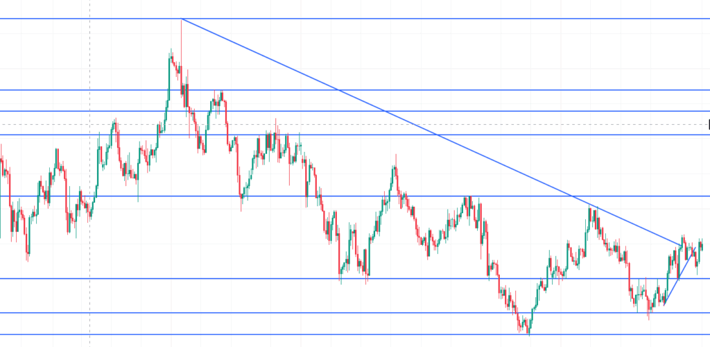 4時間足では高値安値が微妙に切り上がってきている上昇トレンドのような形となりましたが。
