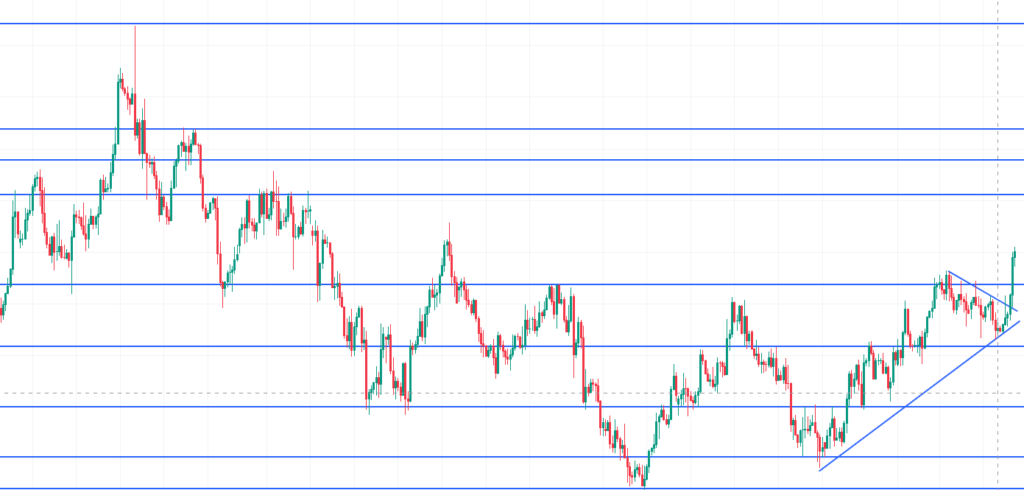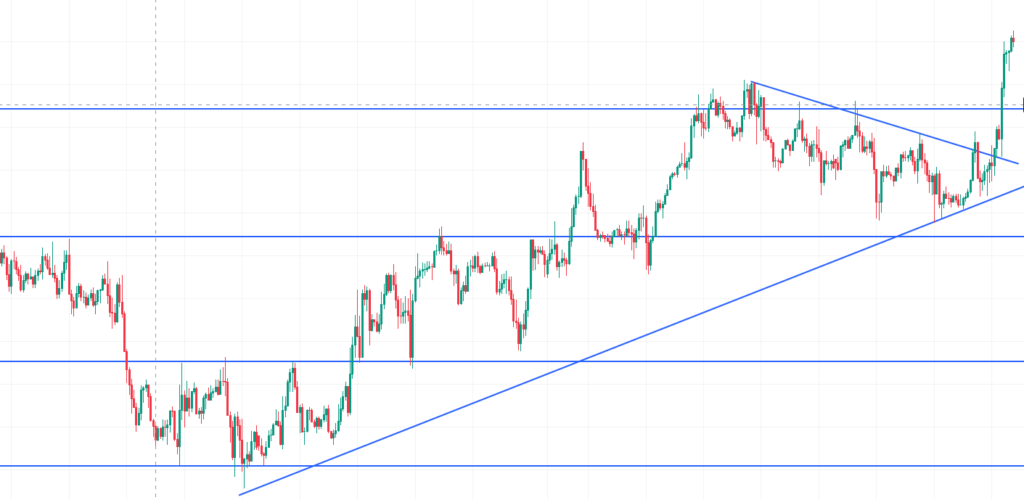 4時間足では三角持ち合いをブレイクし、一気に上昇していきました。