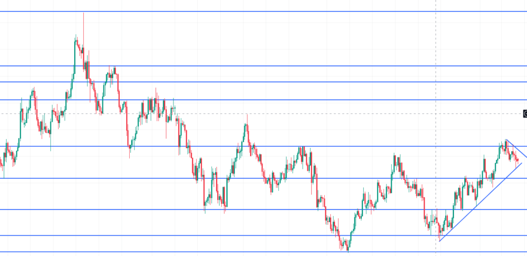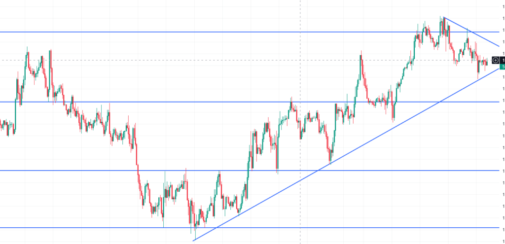 そしてロウソク足は三角持ち合いの中に現在はいます。