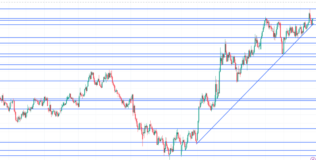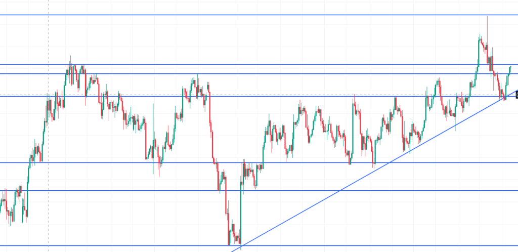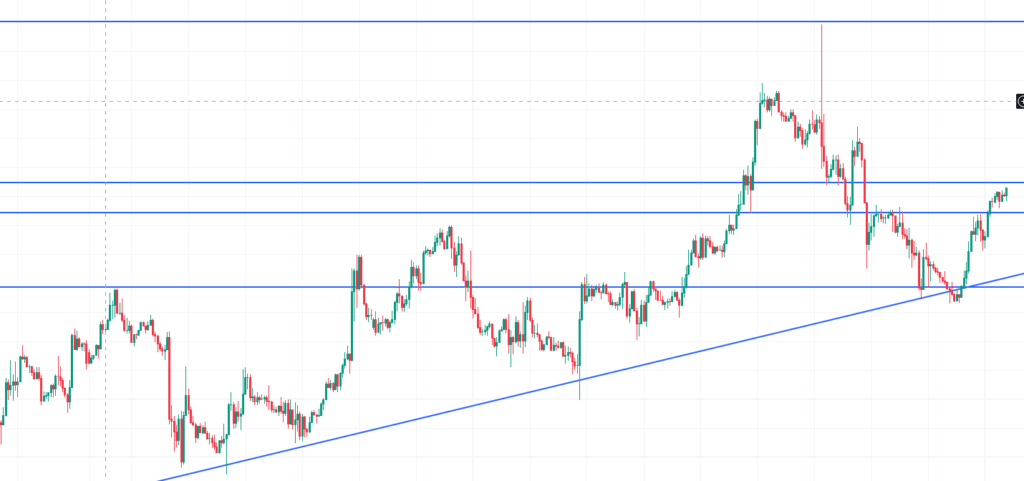 まずは前回高値のラインを目指して、上昇のトレンドラインに沿って上昇する限りは押し目買いを狙います。