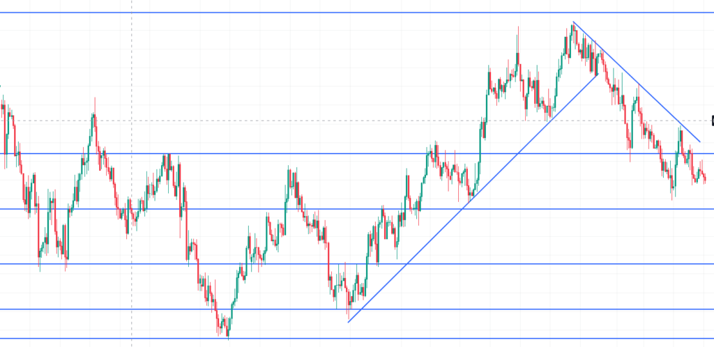 サポートラインに到達することなく上昇し、トレンドラインを越えていくのならトレンド転換。買い目線に切り替え。