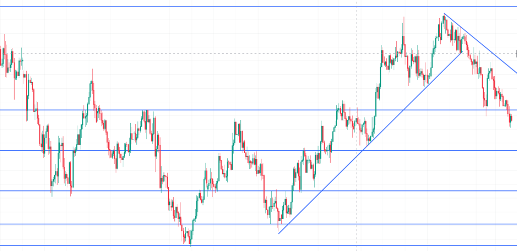 上から順に日足・4時間足・1時間足の3つの時間足チャートを使って、マルチタイムフレーム分析で相場のトレンドがどうなっているかを見ます。