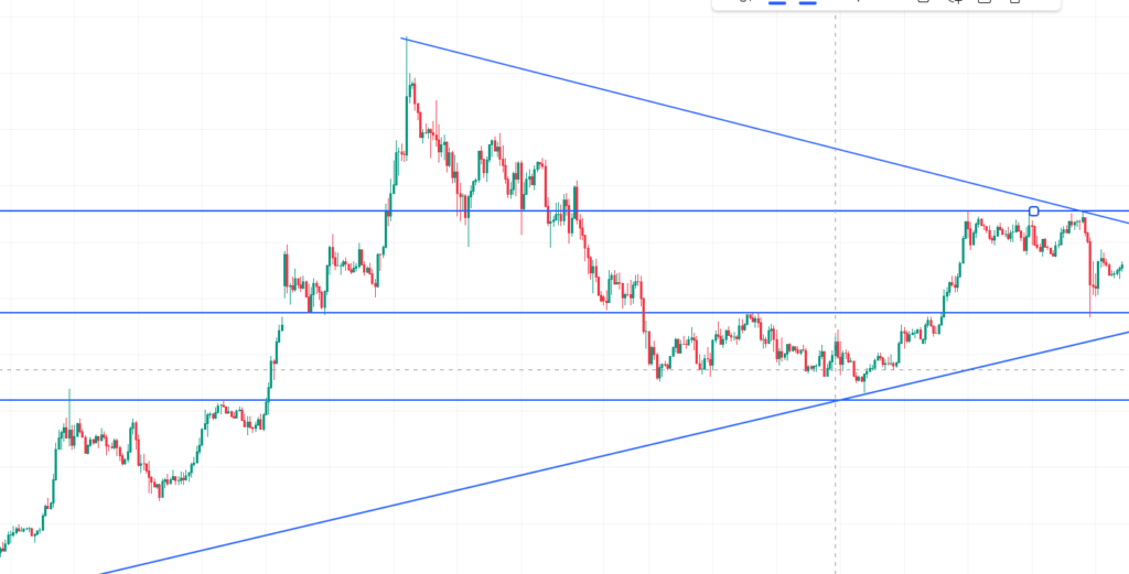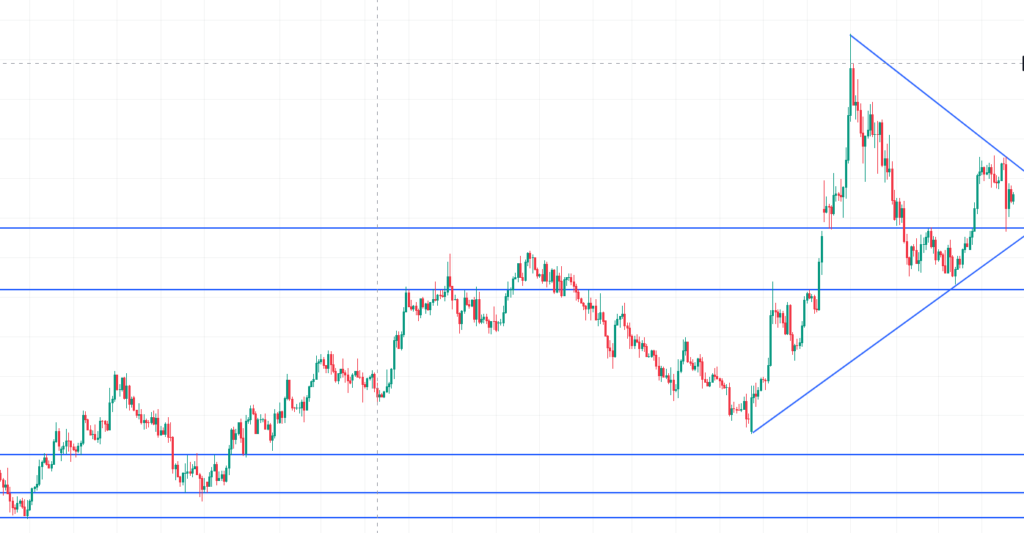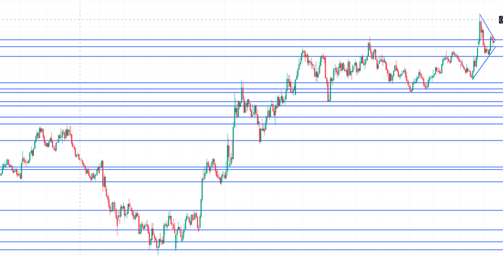 もし三角持ち合いをブレイクするなら、ブレイクした方向についていく形でトレードする予定。