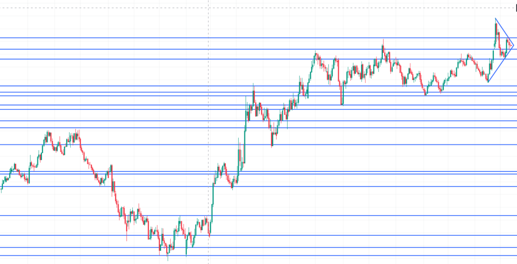 今週は特に動きがない状態。三角持ち合いをブレイクしたらトレードする予定。
