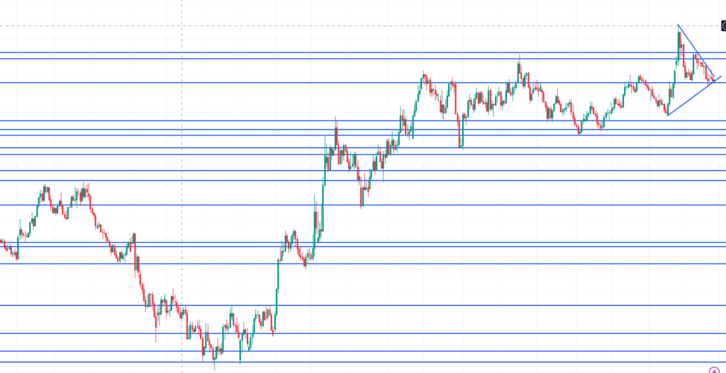 先に結論は「トレンドに転換の可能性あり、三角持ち合いをブレイクするまで待機