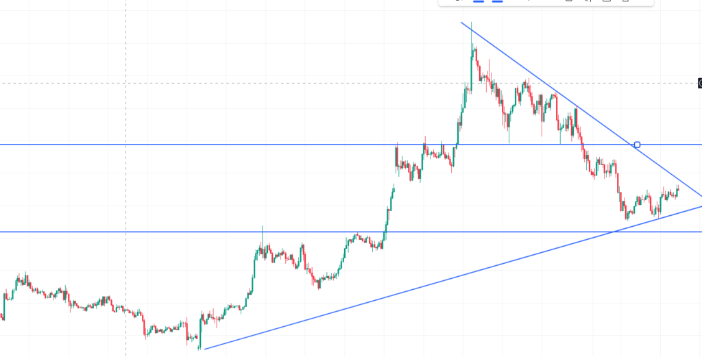 4時間足では三角持ち合いとなっています。