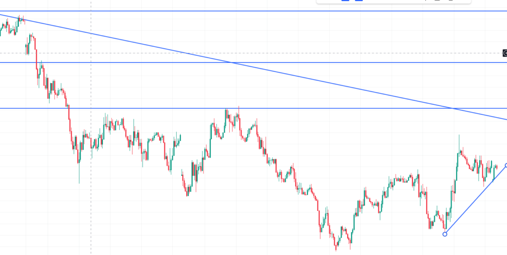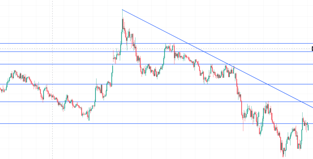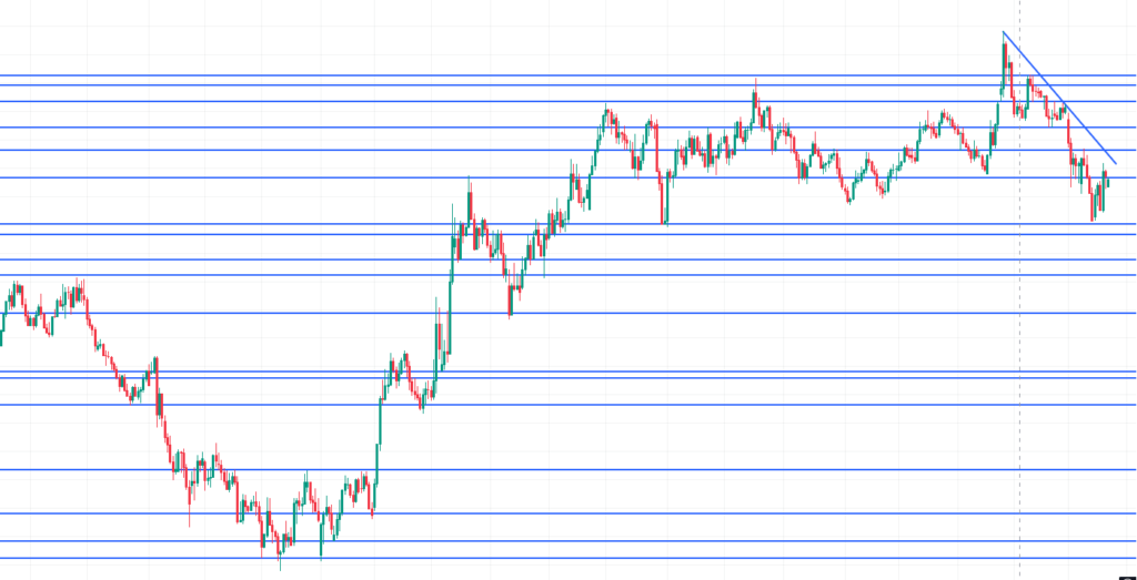 そのためまずはトレンドラインまでロウソク足が到達できるかどうかに注目。